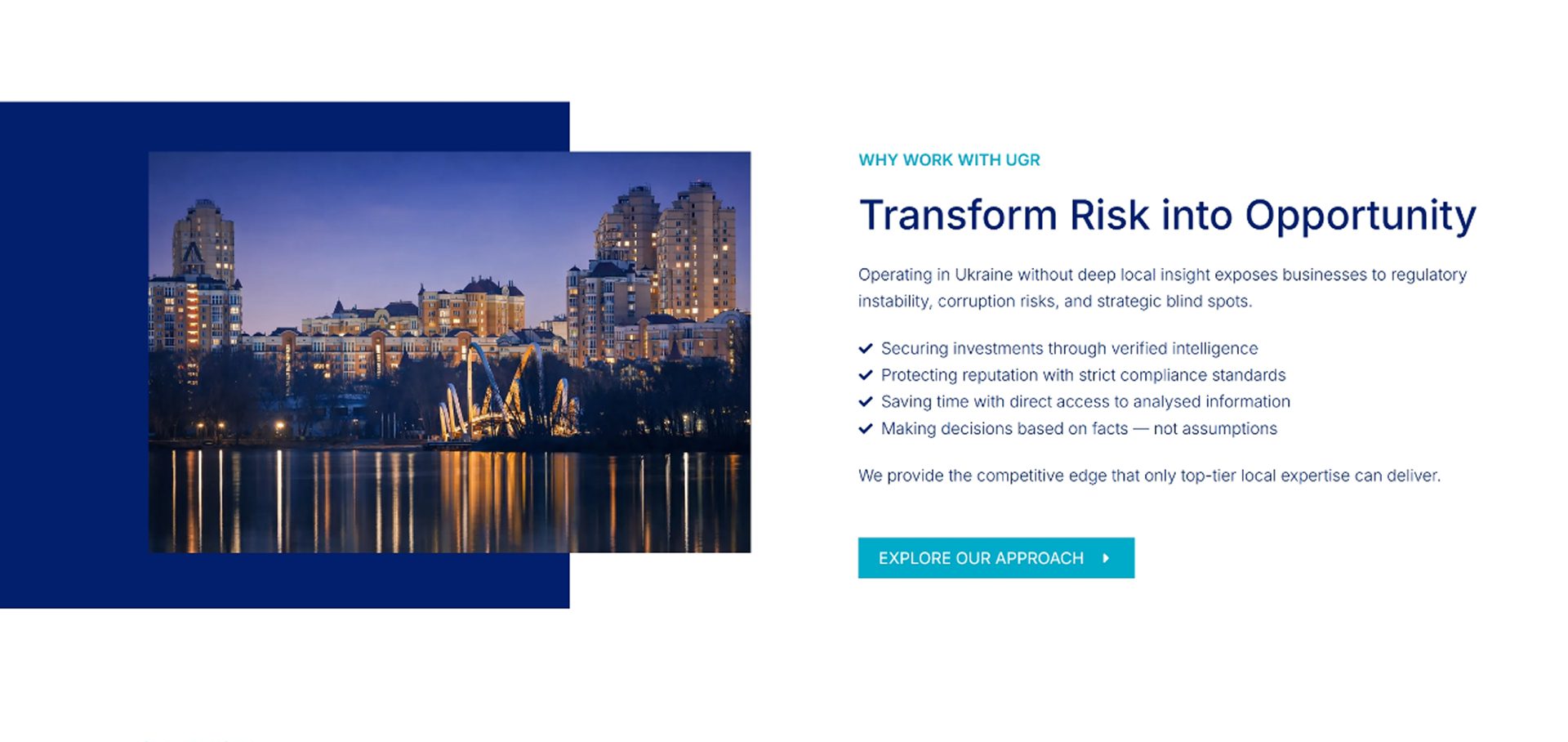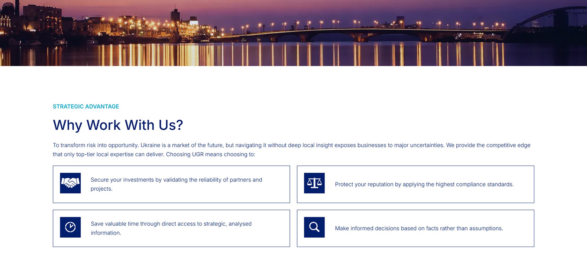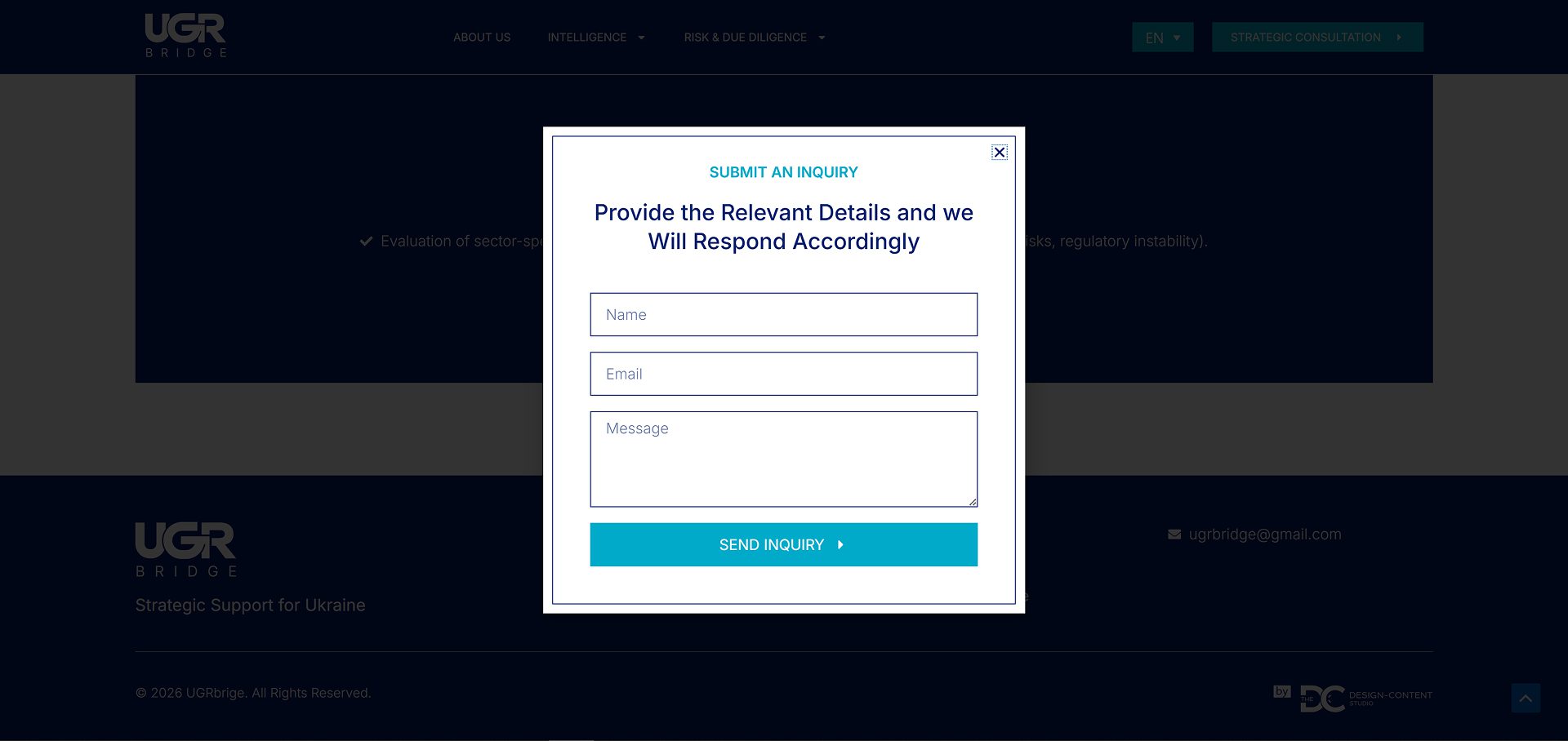 UGR Bridge – корпоративный сайт для консалтинговой платформы, работающий в сфере regulatory intelligence, governmental relations и risk analysis в Украине.