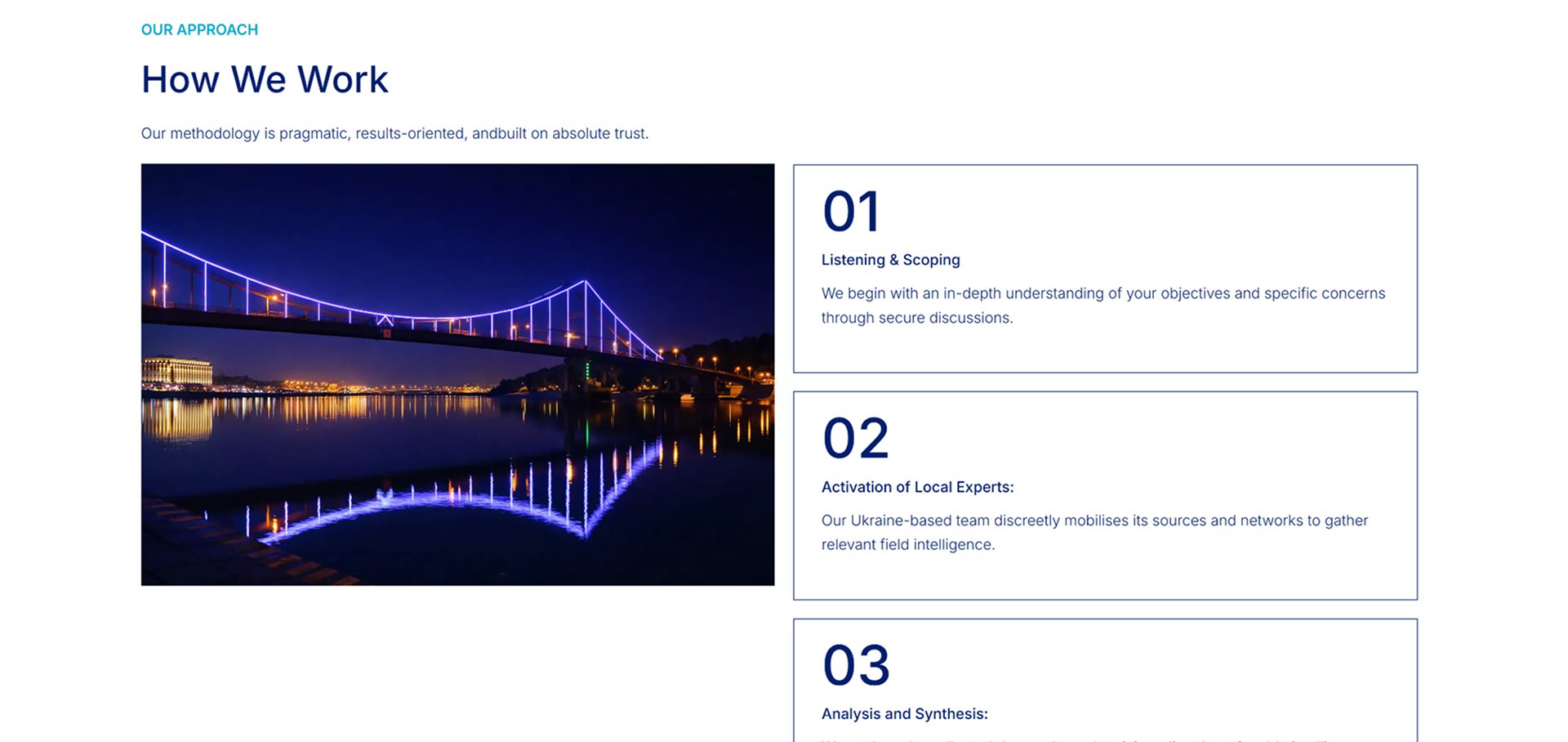 На сайте реализован отдельный блок How We Work, демонстрирующий процесс сотрудничества с клиентами: